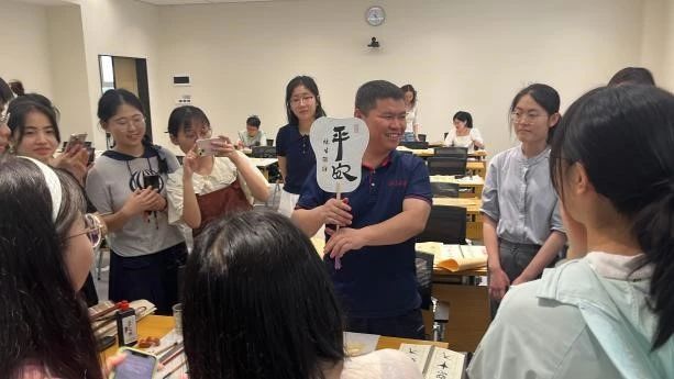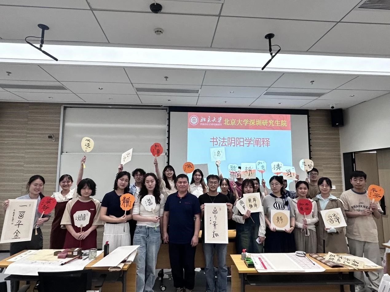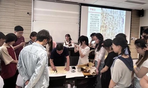 活动共分为三部分。活动伊始,资深书画老师岑秋生,为同学们带来一场生动而富有内涵的书法小课堂。老师从润笔、执笔、行笔等基础技巧讲起,娓娓道来,让同学们对书法的基本要领有了更为清晰的认识。接着,老师现场展示了甲骨文、金文和小篆的基本笔法特点,其运笔如行云流水,字体结构严谨而富有韵味,让同学们大开眼界,深感中华书法的博大精深。