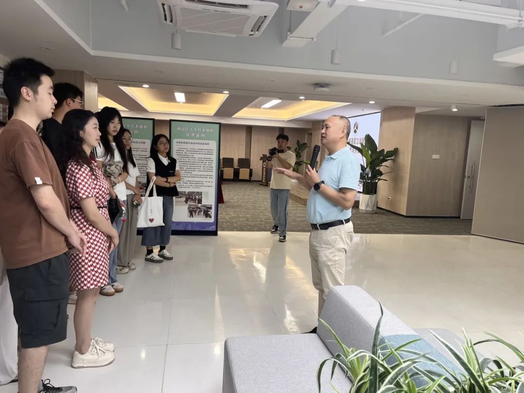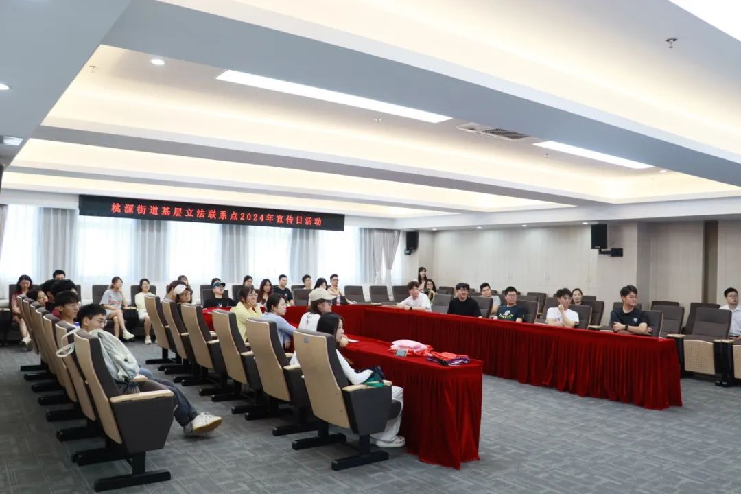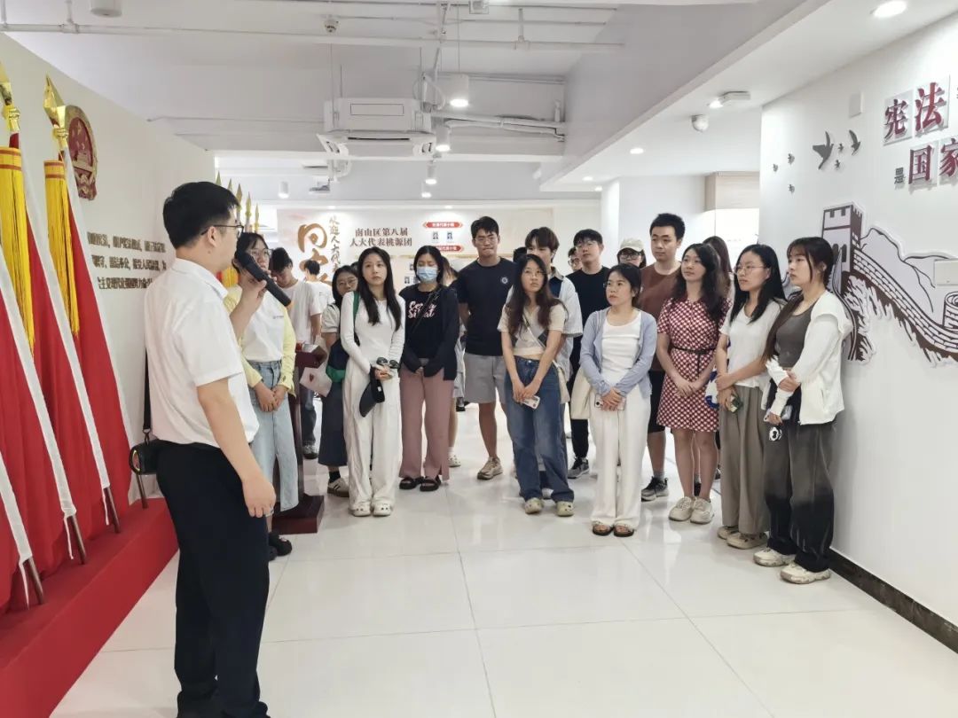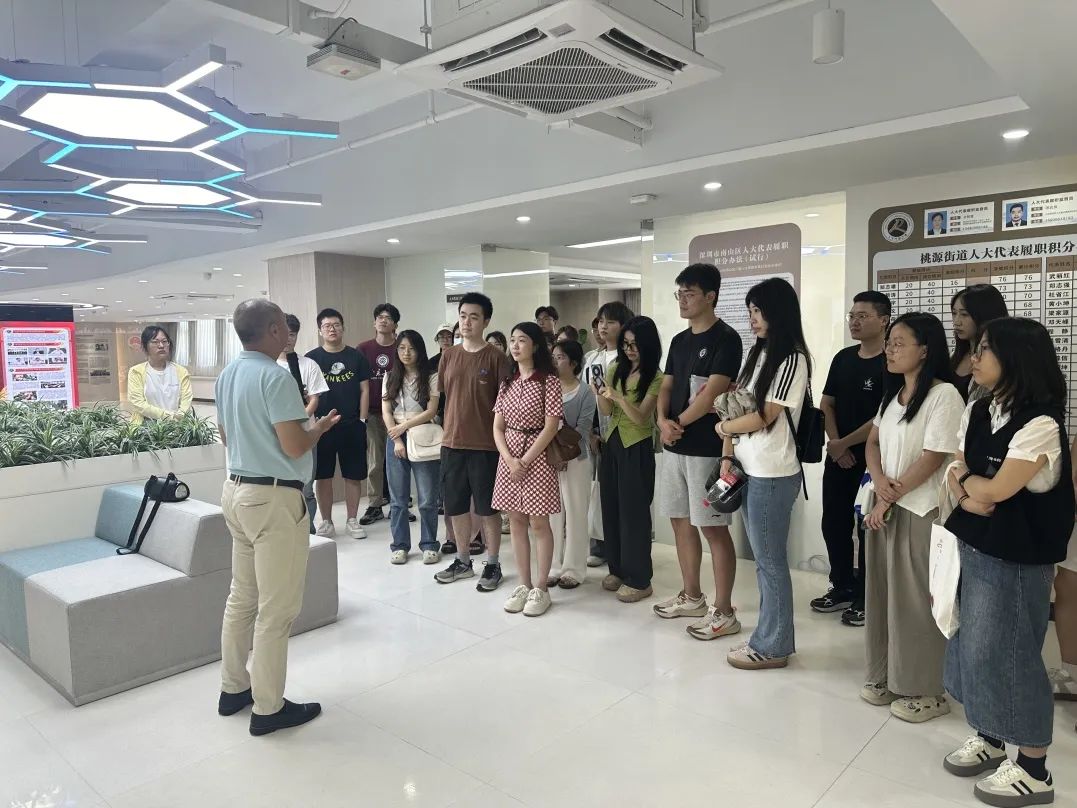 桃源街道工作人员向同学们介绍桃源街道人大代表之家的基本情况。桃源街道人大代表之家是在南山区人大常委会的悉心指导下,通过桃源街道党工委统筹部署,街道人大工委狠抓落实,以“三区融合”为主线,打造首创“1家4阵地”基层人大工作运行模式,是目前全区最大的街道级“人大代表之家”。目前,桃源街道人大代表之家共设有人大文化展示厅、宣教多功能厅、选民议事厅、立法听证厅、休闲区等“10区4厅2室1会”17个区域,具备宣教、履职、服务、研究四大功能,是集人民代表大会制度宣教、人大代表履职、选民群众服务、人大理论与实践研究四大功能于一体的阵地平台。桃源街道始终坚持以人民为中心,推进人大工作贴近群众、贴近实际、贴近生活,形成人大工作在街道“不断层”,代表活动在街道“不断线”,社情民意征集在街道“不断链”的良好局面。