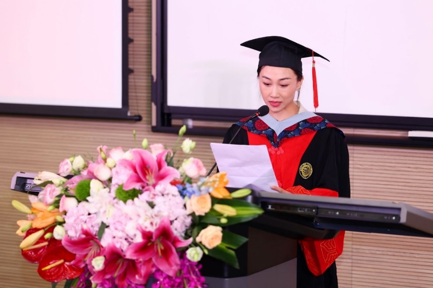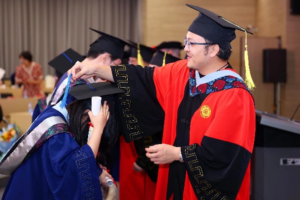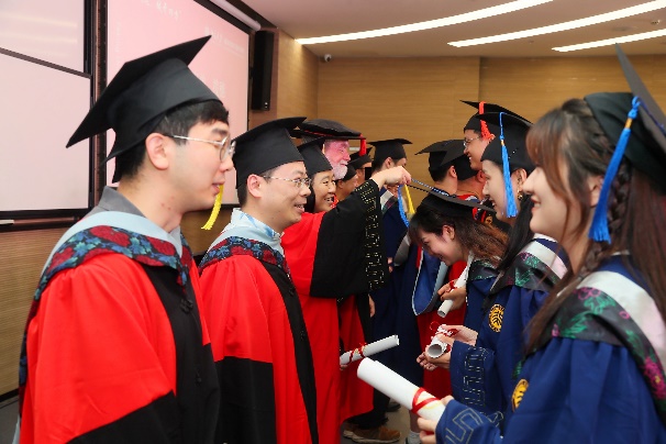 随后,由赵鹏军老师宣读毕业生名单,在场导师们为毕业生们进行拨穗仪式。学位帽上的流苏从右侧拨到左侧,标志着一个阶段的结束,更标志着向着新征程的开始。