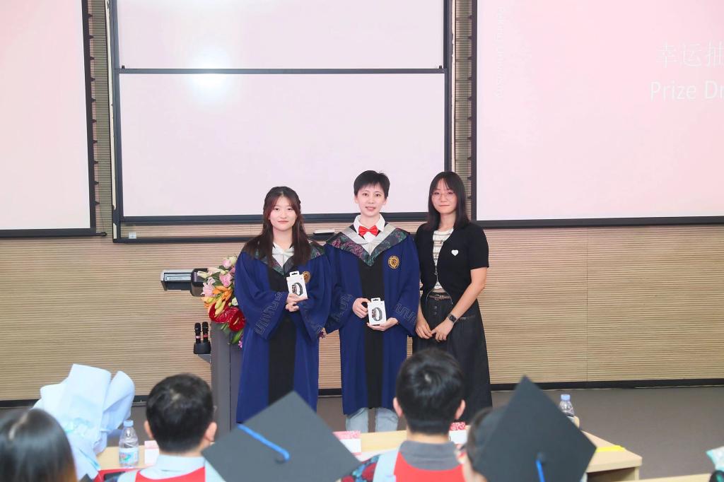 随后进入游戏环节——“最熟悉的陌生人”,毕业生们热情高涨、积极参与,根据给出的五官猜出幻灯片上展示的导师,现场笑声阵阵。在幸运抽奖环节,王蓓老师、王瑞怡老师、赵鹏军经理分别作为抽奖人上台颁奖并与中奖者合影。