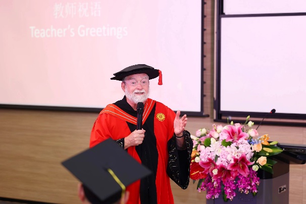 随后是全体老师寄语环节。Ian MacLachlan老师希望同学们今后要始终相信自己拥有战胜困难的能力;曾辉老师叮嘱同学们做好转变身份的心理准备以尽快适应环境寻找到自己的发展路径;吴健生老师表达了对同学们开创美好未来的热切期望;阴劼老师希望同学们铭记“因真理,得自由”;张浩然老师希望大家坚守初心,对此时此刻的理想念念不忘,相信若干年之后必有回响;宫兆亚老师认为一个阶段的结束意味着新阶段的开始,希望同学们今后能够拥抱更宽广的人生;左腾老师祝愿同学们在未来的舞台上继续绽放,常回南燕看看。
