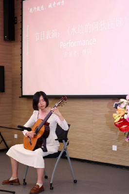接下来进入文艺汇报演出环节。首先,由魏玥同学带来古典吉他演奏《水边的阿狄丽娜》,用悠扬的旋律拉开表演的序幕。接着,由张雯倩同学带来歌曲独唱《You Raise Me Up》,动听的歌声引得阵阵喝彩。