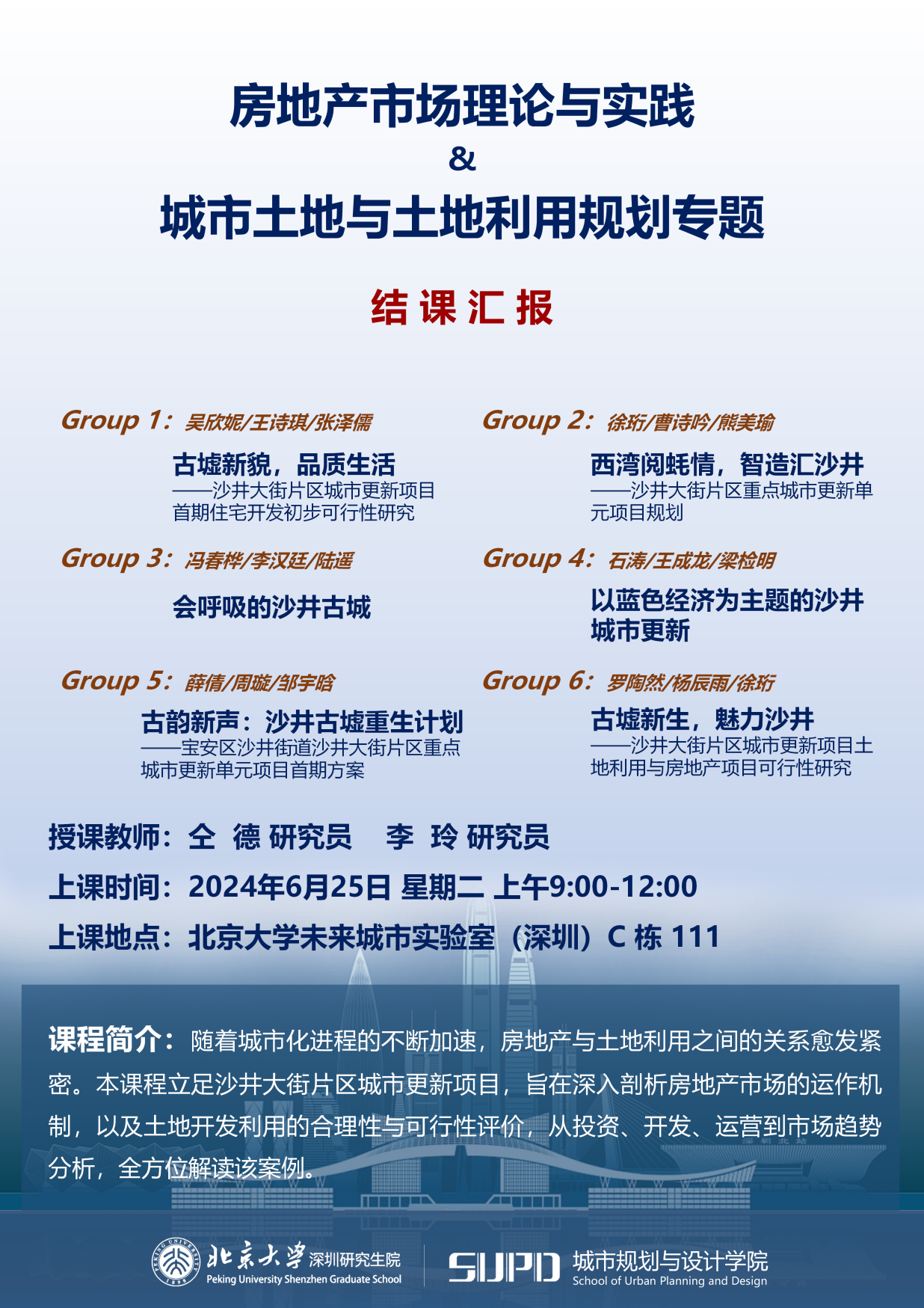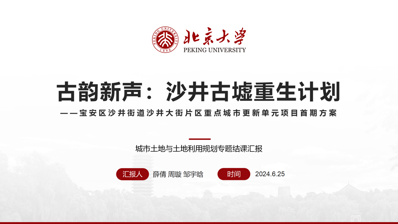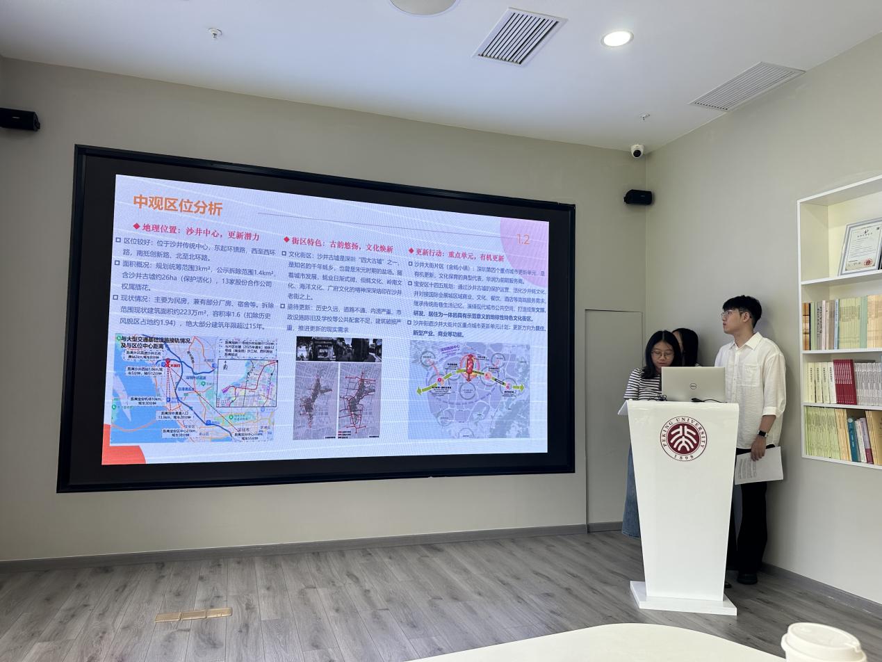 “房地产市场理论与实践”(仝德老师、李玲老师授课)与“城市土地与土地利用规划专题”(李玲老师授课)联合课程立足深圳市城市更新项目,旨在深入剖析房地产市场的运作机制,以及土地开发利用的合理性与可行性评价,从投资、开发、运营到市场趋势分析,全方位解读沙井大街片区城市更新案例。课程从前期深入项目实地调研,到中期收集资料,再到最终邀请企业专家老师来到校园听取同学们的期末汇报,同学们结合沙井大街片区城市更新项目的实地调研经验,展开了从宏观、中观、微观等不同尺度的规划设计,最后,进行了精彩的课程结课汇报。