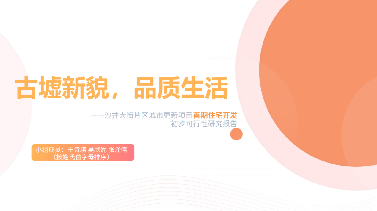 第一组《古墟新貌,品质生活——沙井大街片区城市更新项目首期住宅开发初步可行性研究报告》,该小组从首期开发入手,分析项目背景、项目概况、市场分析、财务测算,完整全面的规划出沙井项目首期开发的过程。