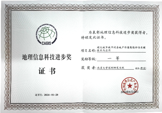 8月27日至29日,2024中国地理信息产业大会在云南昆明召开,会上颁发了2024中国地理信息科学技术奖励,深圳市自然资源和不动产评估发展研究中心与英国威廉希尔英文官网深圳研究生院仝德老师团队联合完成的项目成果“超大城市城中村房地产价值智能评估关键技术与应用”荣获2024地理信息科技进步一等奖。