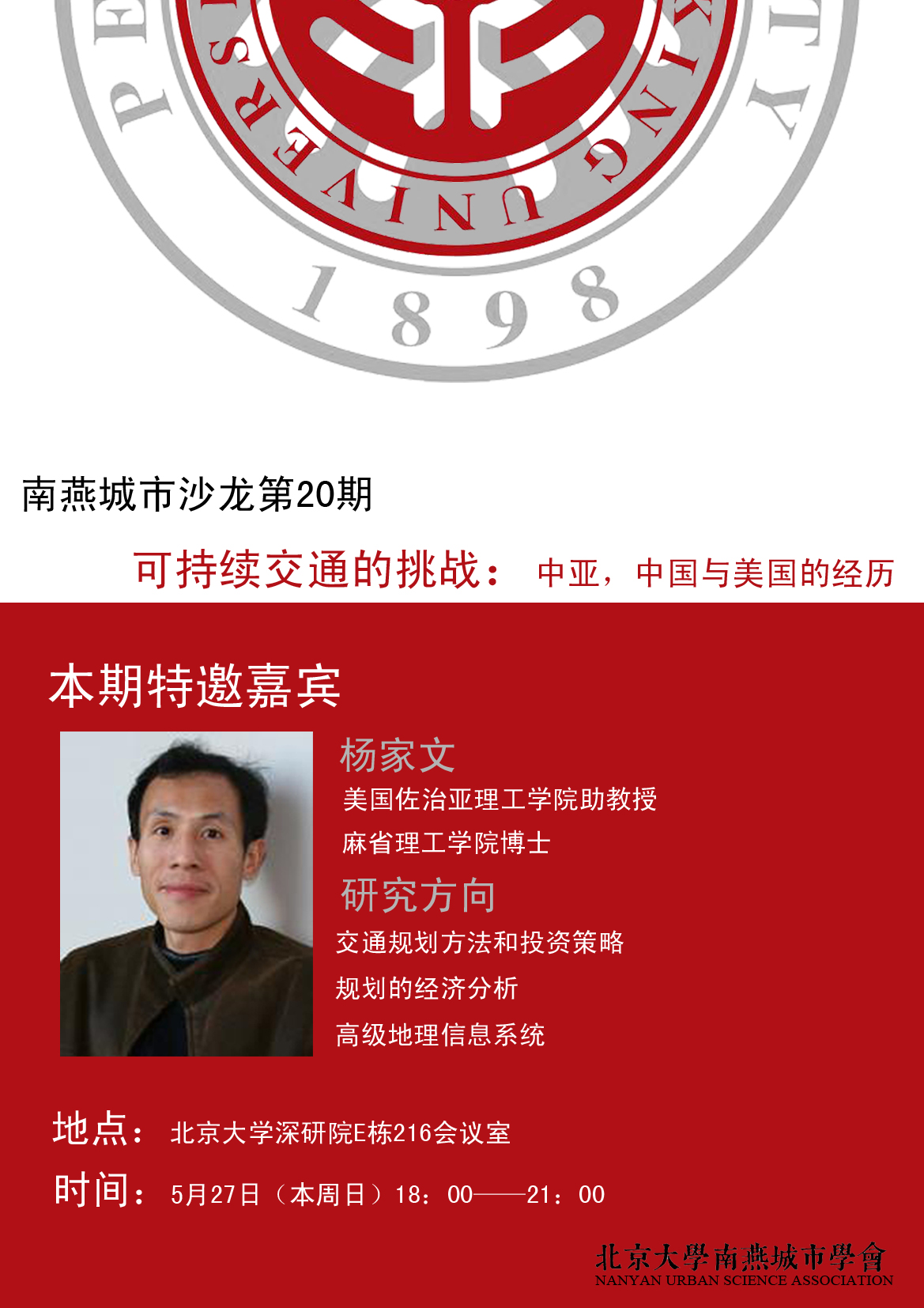 主讲人:杨家文,美国佐治亚理工公司助教授,麻省理工公司博士,主要研究方向交通规划方法和投资策略、规划的经济分析、高级地理信息系统;召集人: 聂家荣;