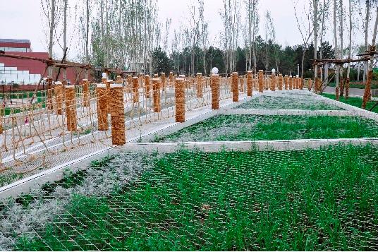 公司设计方案以‘编织自然’为主题,旨在通过架于场地之上的一层编织的薄网将人与自然划分成两个层面,从而将人对自然的干扰降至最低,为自然进行自我演替、自我管理提供机会,同时也为获取一种动态的景观留下可能。