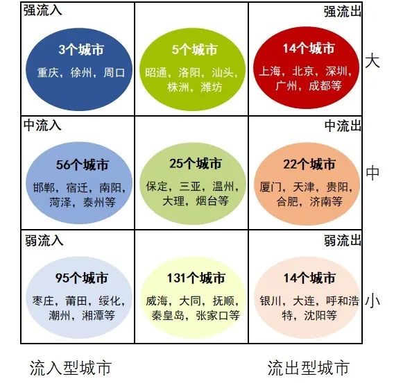 根据春运预测结果从两个维度对367个城市(333个地级行政单位、4个直辖市、30个其他省直管行政区,总共367个)进行分类。第一个维度是各城市春运前15天净流出量,将城市划分为劳动力流出型、流入型和均衡型,第二个维度是春运前15天流出总量,将城市划分为强、中、弱人口流动城市。