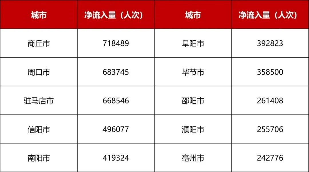 除夕前净流出、净流入分布呈现显著的空间错位。净流出较高的城市主要集中在经济发达地区,如长三角、珠三角、京津冀,同时也包括西安、武汉、成都等省会城市,净流入的主要为劳动力输出大省的城市,例如重庆、阜阳、周口等城市。