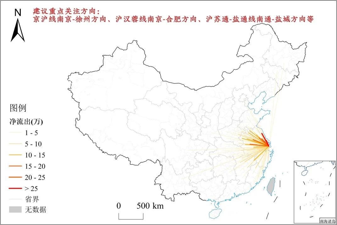 人口就近就业缓解了长距离春运的压力。预测发现,上海、广州等人口流出呈现显著的距离衰减,且周边地区为主要的流出人口吸纳地,例如长三角至苏北、安徽、江西;广深至广东省其他城市和广西、湖南等临近珠三角城市。