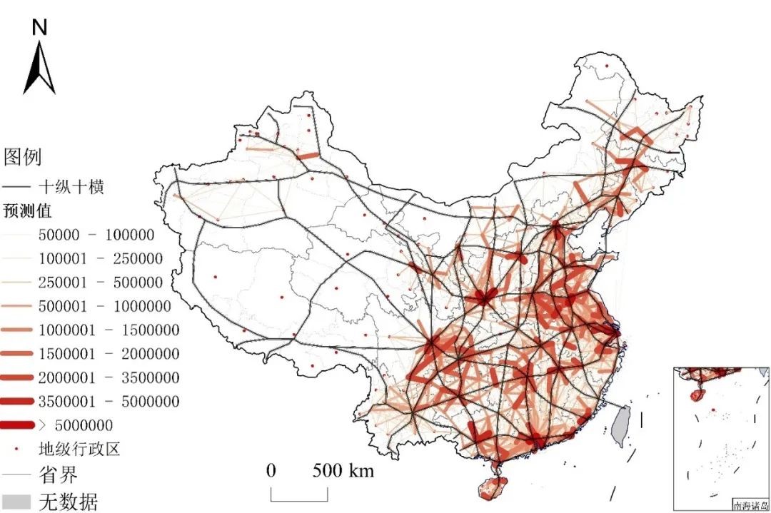 3. 基于全国城市的人口规模和地理空间关系,构建全国城市间的重力模型,结合预测结果对重力模型相关参数做出估计,并校核调整得到最终的流量预测结果。