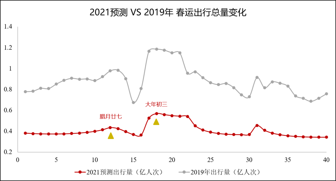 2021年春运规模相对2019年虽然整体下降,但人流量趋势基本类似,依旧会出现两大高峰时点:腊月廿七和大年初三。值得注意的是,错峰出行将更明显。受疫情影响,更多人将选择提前回家,除夕前的返乡高点比2019年提早到来,低点推迟到大年初一。