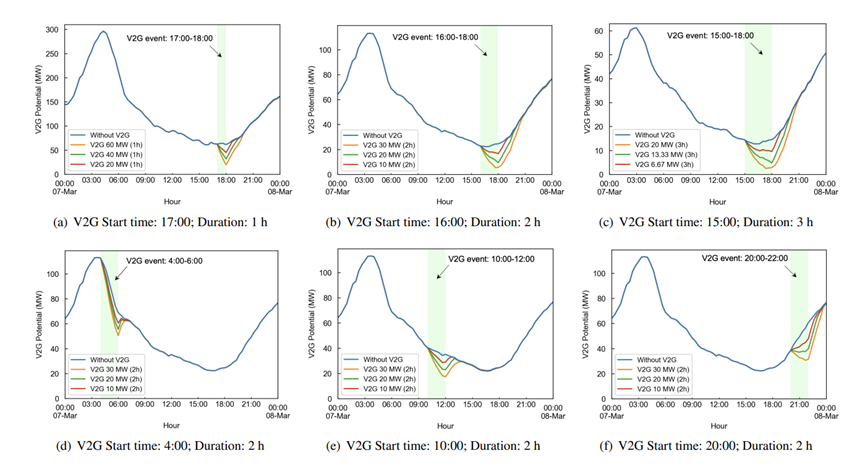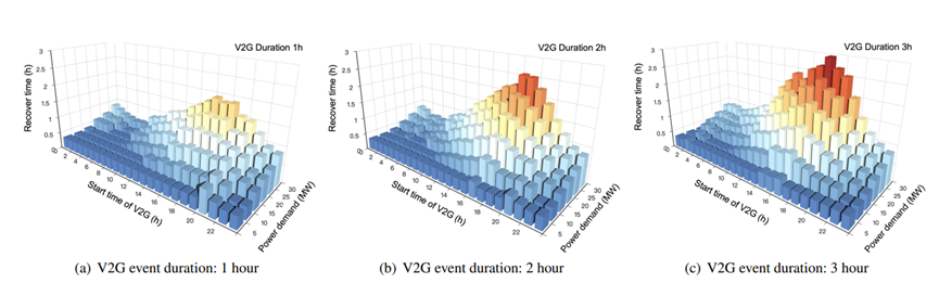 可以观察到系统在不同时间段、功率需求和持续时间下的灵活性有所不同。其中V2G系统在晚间高峰时间提供1小时、2小时和3小时的电源供应,明显可以看出,持续时间越长,系统恢复时间就越长。这是因为ET-V2G系统的长时间利用导致了持续的车辆放电,占据了充电的持续时间,对剩余车辆的SoC产生了更显著的整体影响。V2G事件对整个系统的影响因时间段而异,所需的恢复时间也相应不同。在过夜的4-6 AM进行V2G事件时,所需的恢复时间相对较短,而在下午4-6 pm的高峰期则需要更长的恢复时间。这种差异是由于在不同时间连接到电网的车辆数量波动。在V2G事件后期,连接到电网的车辆越多,系统恢复的时间就越短,因为更多的车辆可以同时充电。