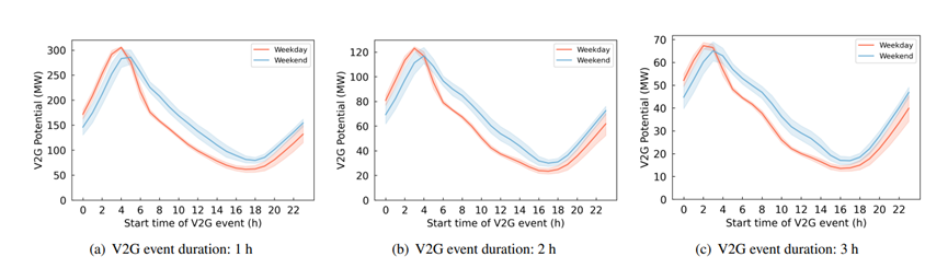 从系统角度来看,在1小时的V2G事件持续时间内,系统可以提供50到300兆瓦的能量。在2小时内,范围为20到120兆瓦,而在3小时内为10到70兆瓦。潜力表现出每日循环波动。对于一个典型的日子,V2G可以提供的能量经历了明显的周期性变化,在凌晨2-4点之间达到峰值,并在下午4-6点之间达到谷值。在夜间,当电动出租车的SoC水平较高且更多的电动出租车连接到电力系统时,可以提供更大的能量容量。在工作日与周末进行比较时,幅度相似。然而,在周末白天,V2G潜力较工作日更高,而在夜间较低。
