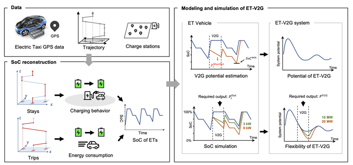V2G模式的优势在于利用电动汽车(EVs)作为移动电源储存单元来平衡电力需求和供应,提高电网稳定性,改善能源效率,并促进可再生能源的整合。电动出租车具有可预测的使用模式、频繁的充电习惯和大量的空闲时间等独特特征,使它们成为推动V2G实施的理想选择。本文提出了一个综合模型,能够分析由ET车队组成的整个V2G系统的潜力和灵活性,基于出租车轨迹数据。该模拟提供了评估系统对V2G事件的反应的一种方式。在深圳的案例研究中,得出拥有每日充电需求和能耗的ET车队保持稳定的运营模式,其操作呈现显著的周期性,ET-V2G系统在需要进行能量存储和供应时具有相当大的潜力和灵活性。对于一支拥有19,900辆ET的车队,ET-V2G系统能够在傍晚高峰时段提供超过50兆瓦的电力,2小时为30兆瓦,3小时为20兆瓦,同时在2-3小时内进行恢复,而不会干扰ET的正常运行。通过采用这种战略方法,我们可以最大化从这项技术中获得的好处,从而为电力系统的高效和可持续管理做出贡献。