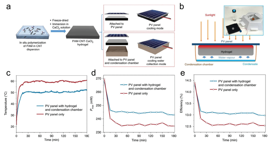 被动蒸发冷却设计在冷却方面具有优势,但需要额外的水供应以保持连续运行,可能增加光伏系统的复杂性和成本。一种有前景的水凝胶设计形成水吸附-蒸发循环,实现了光伏冷却的持续运行(图2a、b)。采用这一策略,光伏电池温度降低10K,冷却功率约为295W/m⟡,相比普通光伏电池提高了13-19%的发电量(图2c-e)。引入强吸水剂(LiBr)到聚丙烯酰胺水凝胶中,同样可实现连续蒸发冷却效果(图2e)。商业结晶硅光伏电池通过此方法可实现大约17K的温度降低,提高光电转换效率1%。此外,创新了基于海洋多糖、亲湿性盐和光热聚合物的大气水收集器,可实现可逆吸附-解吸附循环,提供光伏电池蒸发冷却效果。这种方法可将工作温度降低5-10K,提高光电转换效率0.5%。