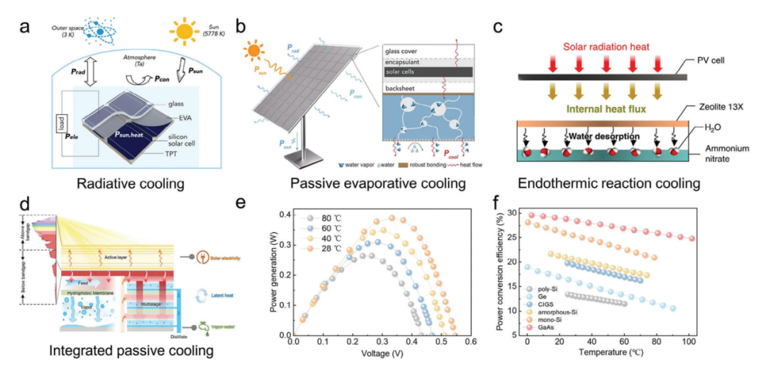 辐射冷却特点包括易加工、低成本、兼容性良好(图1a)。水凝胶和沸石等水含量丰富的材料推动了被动蒸发冷却的发展,提供简便的耦合方法,实现强大的冷却功率密度(图1b)。吸热反应用于吸收水凝胶或水含量丰富材料的水或蒸汽,为光伏面板提供额外冷却,其冷却能量密度超过2800 kJ kg⁻¹,具有巨大的应用潜力(图1c)。这些被动冷却方法可以集成到新兴的光伏冷却装置中,提高发电量,并为日常生活提供热水或清水(图1d)。通过这些冷却方法,光伏面板的工作温度降低,显著提高各种光伏面板的光电转换效率,包括硅基光伏、锗光伏、砷化镓(GaAs)光伏和钙钛矿光伏等(图1e,f)。