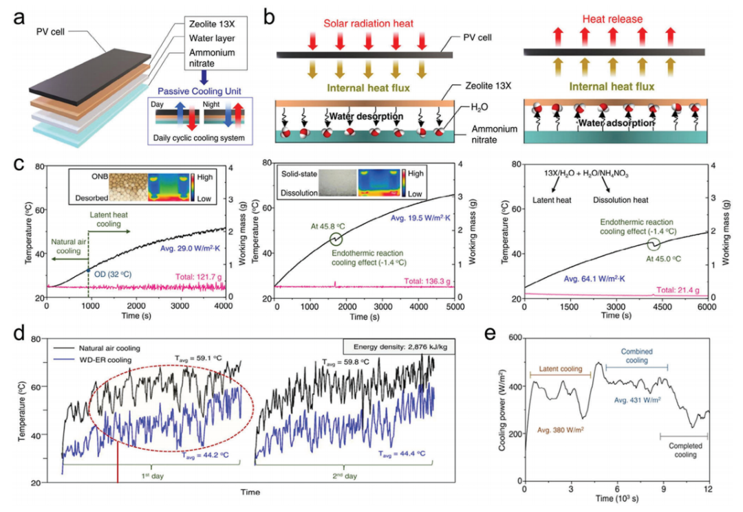 吸热反应通过被动蒸发冷却中的水触发,进一步增强了光伏板的散热效果。用于实际被动冷却应用,直到最近提出基于硝酸铵(NH4NO3)/H2O的吸热反应可用于光伏冷却(图3a,b)。设计了融合蒸发冷却和吸热反应冷却的混合结构,为光伏设备提供充足的冷却能力。具体来说,光伏热促使沸石中水分蒸发,为NH4NO3的溶解提供足够水。因此,光伏热量通过吸热反应散发,导致较高的热导率系数(图3c)。采用这策略,冷却能量密度达到约2876千焦耳/千克的最佳值,带有403瓦/平方米的冷却功率,使光伏面板工作温度降低约15.1摄氏度(图3d,e)。其他水解反应也可能是化学冷却的候选者,如NH4ClO4/H2O和NH4IO3/H2O,其水解焓为30千焦耳/摩尔以上,甚至高于NH4NO3/H2O的水解焓(约25千焦耳/摩尔)。但这些化合物易燃且具爆炸性,限制了其实际应用。