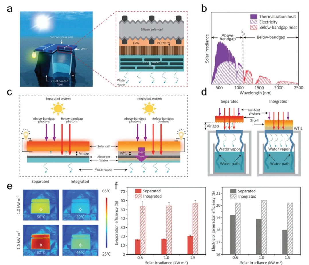 集成被动冷却展示了一些被动冷却装置,突显了这些装置在提高发电效率和淡水供应方面的潜在机制。团队开发了串联太阳电-水发电机(图4a),通过利用带隙以下太阳能为水净化器提供加热,实现光伏大幅降温(图4b)。设计了防水的热互联层,协同实现两大好处,并在光伏工作温度降低和淡水产量方面展现极大的优越性(图4c,d)。借助这些优势,混合串联设备在一倍太阳光照下实现0.80千克/㎡/小时的净化率和204瓦/㎡的发电量。