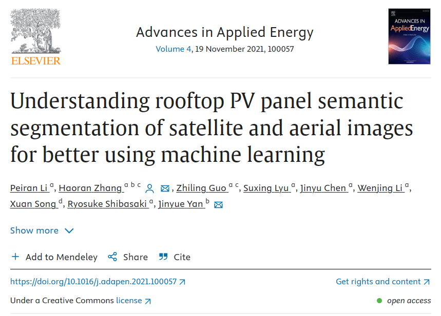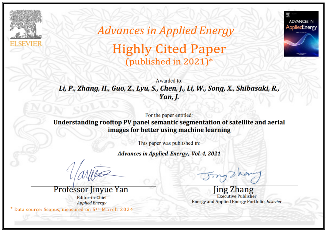 日前,张浩然助理教授团队发表的研究论文Understanding rooftop PV panel semantic segmentation of satellite and aerial images for better using machine learning荣获Advances in Applied Energy2024年度高被引论文奖。