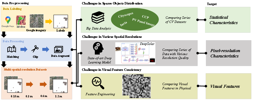 光伏产业的繁荣发展和光伏应用的增加要求在准确、及时的装机容量数据的基础上进行更好的规划。与通常费时费力的人工统计方法相比,使用卫星/航空图像来估计现有的光伏装机容量提供了一种具有高效、准确、通用的新方法。现有的研究已经验证了从涉及机器学习技术的图像中分割光伏板的可行性。然而,由于光伏板语义分割的特殊性,在设计和应用机器学习工具时需要仔细考虑问题的提出、数据质量和模型的可解释性。