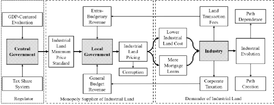 (2)分析框架:从企业角度来看,低成本土地显著降低了生产成本,并改善了贷款条件,降低了融资约束,从而吸引了大量企业入驻。此外,产业聚集带来了显著的“集聚租”,通过劳动资源的协同利用、企业间的知识交流和运输成本的减少,促进了产业竞争力的提升。从政府角度看,土地交易收入不仅能补充预算外收入,还能通过企业和产业的进入产生未来的财政收入。但实际上,政府干预并非万能,过度干预可能支持低效或不适合的企业,增加腐败风险,并带来企业发展扭曲和环境污染等问题。