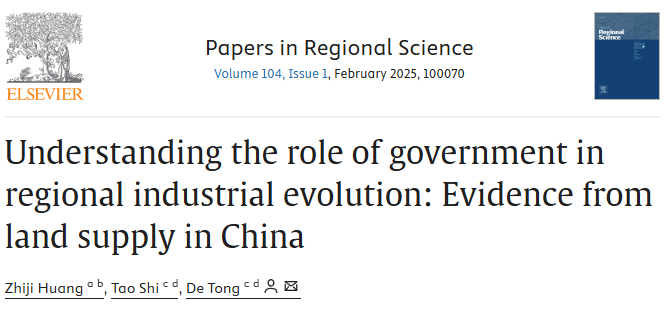 原文发表信息:Zhiji Huang, Tao Shi, De Tong, Understanding the role of government in regional industrial evolution: Evidence from land supply in China, Papers in Regional Science, Volume 104, Issue 1, 2025, 100070, ISSN 1056-8190, https://doi.org/10.1016/j.pirs.2024.100070.