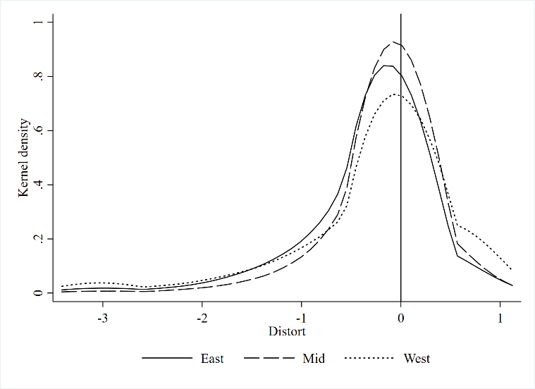 自变量是土地实际供应价格与基准价格的偏离度。2006年底,鉴于地方政府的土地定价行为导致价格下降并助长不健康竞争,中央政府发布了《工业用地出让最低价标准》。中央政府设定的工业用地基础价格依据土地质量分类,并与土地的经济价值密切相关。因此,通过评估实际供应价格与基准价格之间的差异,我们可以估算政府降低土地价格的倾向,并将其作为土地供的代理变量。