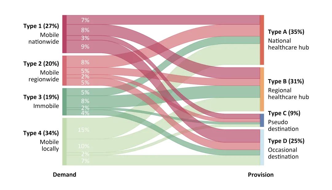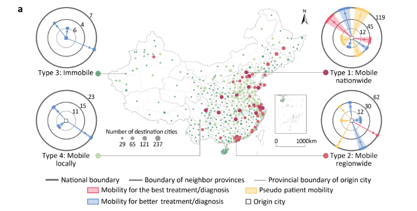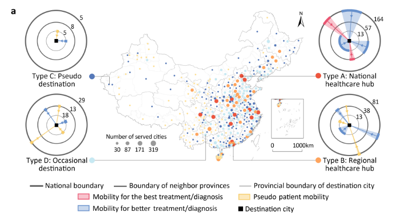 研究发现城市间就医流动呈现三种类型(图2),分别是寻求最佳治疗的流动(5%)、寻求更好治疗的流动(76%)、以及流动人口返乡就医流动(19%)。其中,流动人口返乡就医流动(pseudo patient mobility)指流动人口从大城市或特大城市临时返回医疗资源较为匮乏的家乡就医。