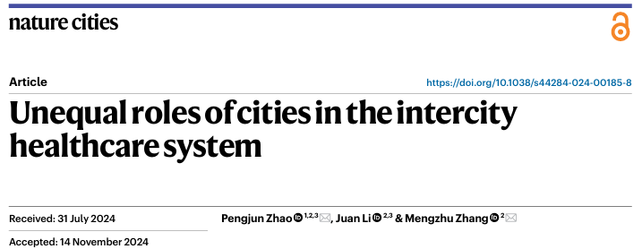 该研究成果以“Unequal roles of cities in the intercity healthcare system”为题于2025年1月2日在线发表于Nature Cities期刊上。英国威廉希尔英文官网赵鹏军为论文第一作者和通讯作者,李娟为论文共同第一作者,张梦竹为论文共同通讯作者。该研究受到国家自然科学基金(41925003, 42301220, 42401228)等资助。