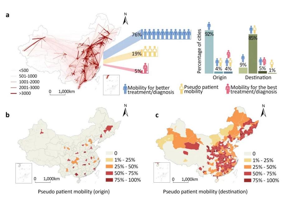 图2. 中国异地就医流动格局 a. 三类异地就医流动在全国中的占比,不同类型就医流动涉及的流入地和流出地在全国城市中的占比;b. 流出地城市中流动人口返乡就医的占比;c.流入地城市中流动人口返乡就医的占比