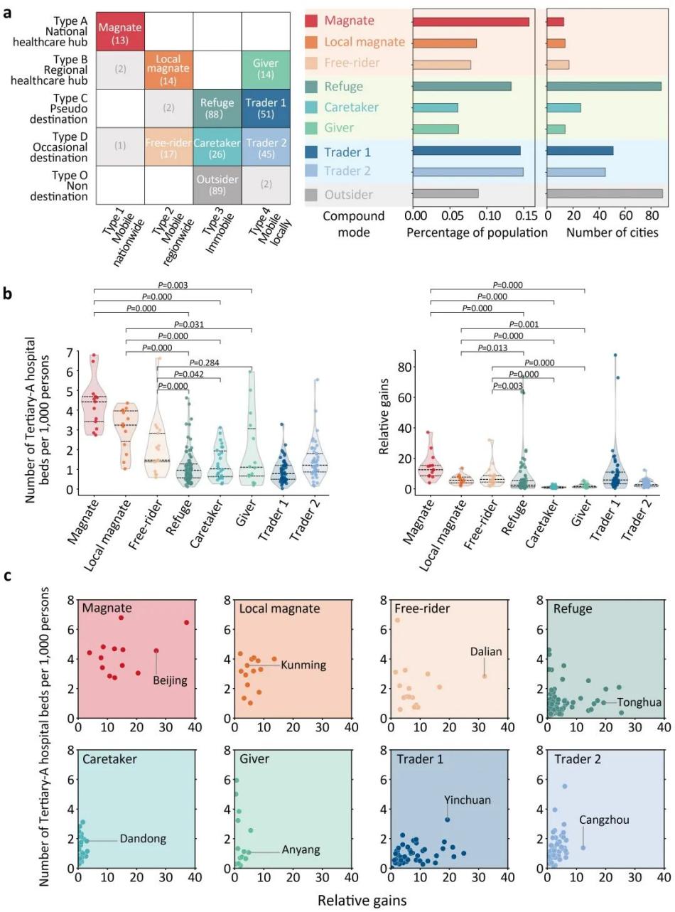 图6. 城市在IHS中的复合角色及其不平等效应。a. 综合供给和需求角色的9种复合模式;b. 城市本地医疗资源对本地居民需求的满足程度(左),本地居民获得跨城医疗资源的能力(右);c. 本地医疗供给充足度与跨城就医获取能力的关系