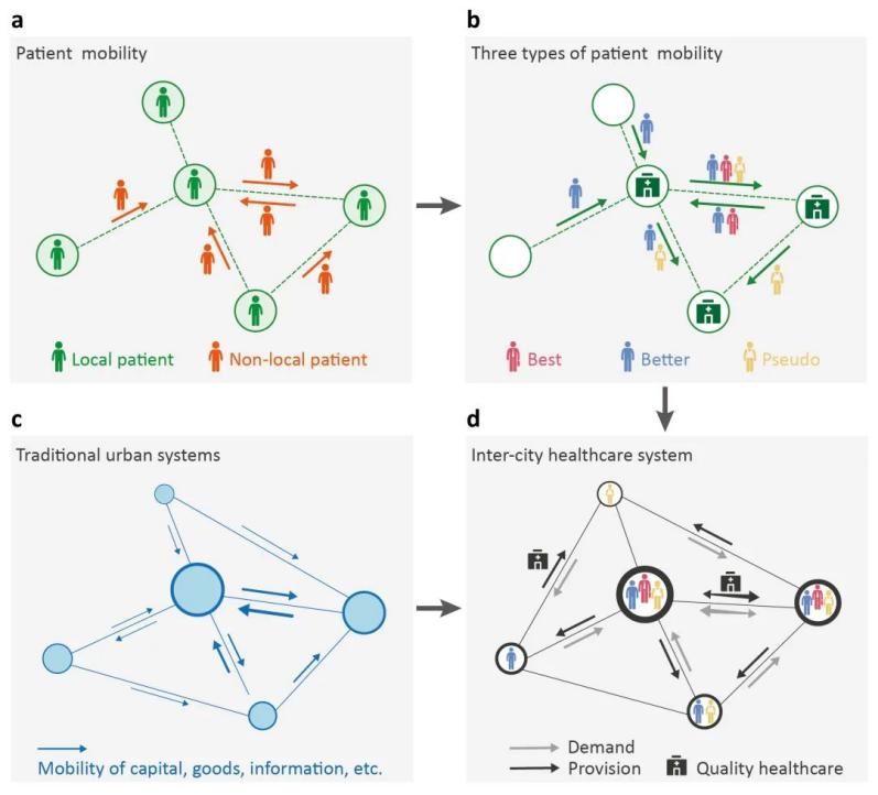 英国威廉希尔英文官网赵鹏军教授课题组聚焦城市之间在医疗供给与需求上的相互依赖关系,构建了“城市间医疗体系”(Intercity Healthcare System, IHS)理论框架(图1),采用3亿多手机用户的出行轨迹数据,识别了到访中国1404家三甲医院的近两百万次异地就医行为,揭示了364个城市间的异地就医格局(图2),并探明了不同城市在跨城就医流动中的角色。