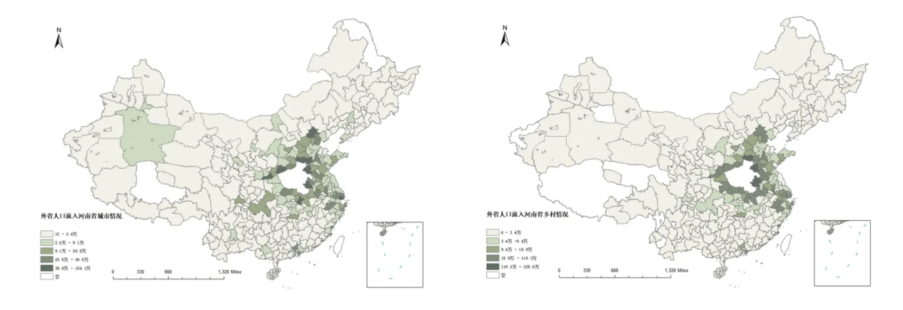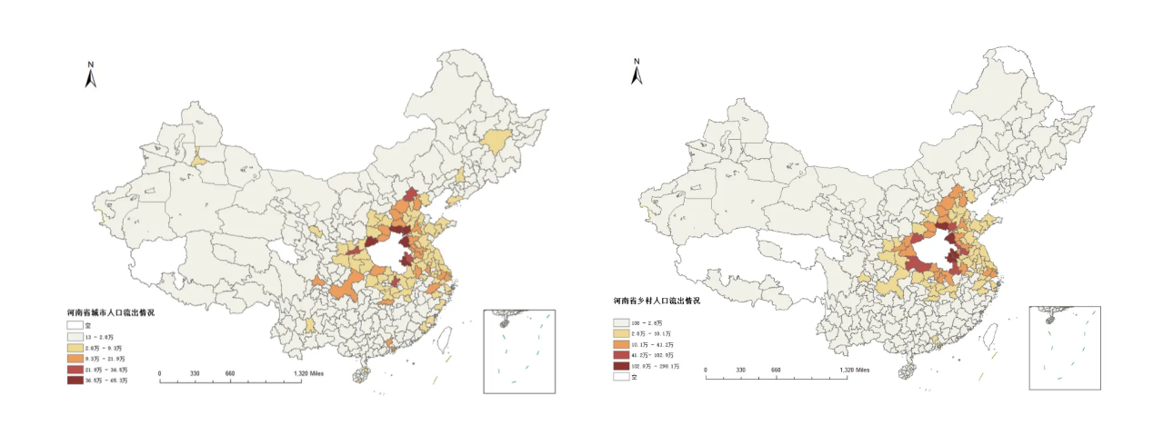 8. 河南省城乡人口跨省流动呈现农村人口流动集中于周边区域、城镇人口流动分散且覆盖面广