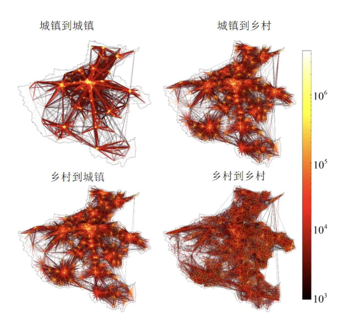 河南省城乡人口流动形成了以城镇为核心的广域辐射网络、以乡村为节点的局域互动网络,以及城乡双向互动格局。具体而言,城镇到城镇的流量规模较大,且辐射距离较远,体现了城镇之间紧密的经济和社会联系,表明其在区域发展中扮演核心枢纽角色;相比之下,乡村到乡村的流量规模较小且距离较短,主要限于邻近社区的日常互动,反映出乡村区域较强的地方化和自给自足特性。城乡之间的流量(城镇到乡村与乡村到城镇)表现出对称性,既有农村居民因就业或资源需求流向城镇,也有因返乡或乡村开发从城镇流向乡村的现象,这种双向流动体现了城乡间的密切依存关系与人口资源的动态分配。