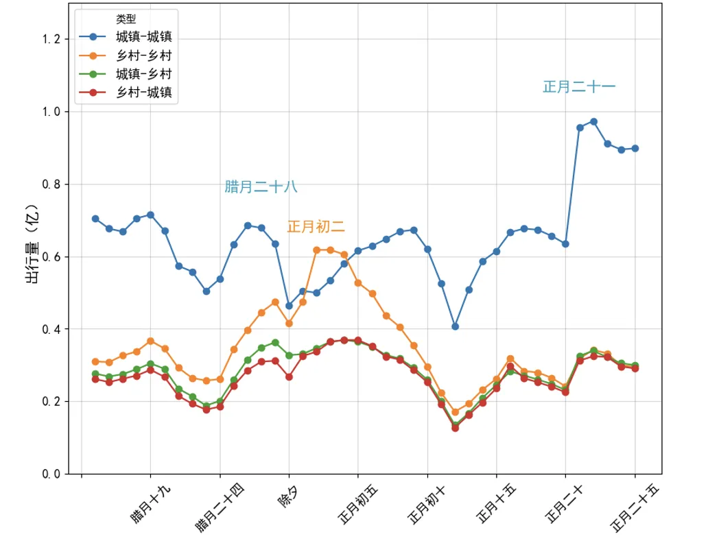 预计河南省春运高峰主要出现在腊月廿八、正月初四、正月十六和正月廿二,其中腊月廿八和正月初四的峰值差异较小,反映了城乡融合和交通便利性提升对省内流动的推动作用。许多居民选择节前返乡和节后参与本地年俗活动为主要出行模式,而非集中返工。相比全国范围在正月十六和正月廿二形成的返工高峰,河南省内部的返工高峰则更显著地延后至正月廿二,表明城乡间不同的经济条件和文化传统对返工时间的影响。城镇居民在正月廿一则出现复工高峰,这反映出城镇劳动力市场的灵活性和工作安排的多样化。而乡村内部居民的出行高峰主要集中在正月初二,春节后的返工现象并不显著。这种城乡融合背景下的城乡人口流动模式,既体现了河南省城乡联系的紧密性,也突显了城乡之间在就业形态、社会活动和文化习惯上的差异。