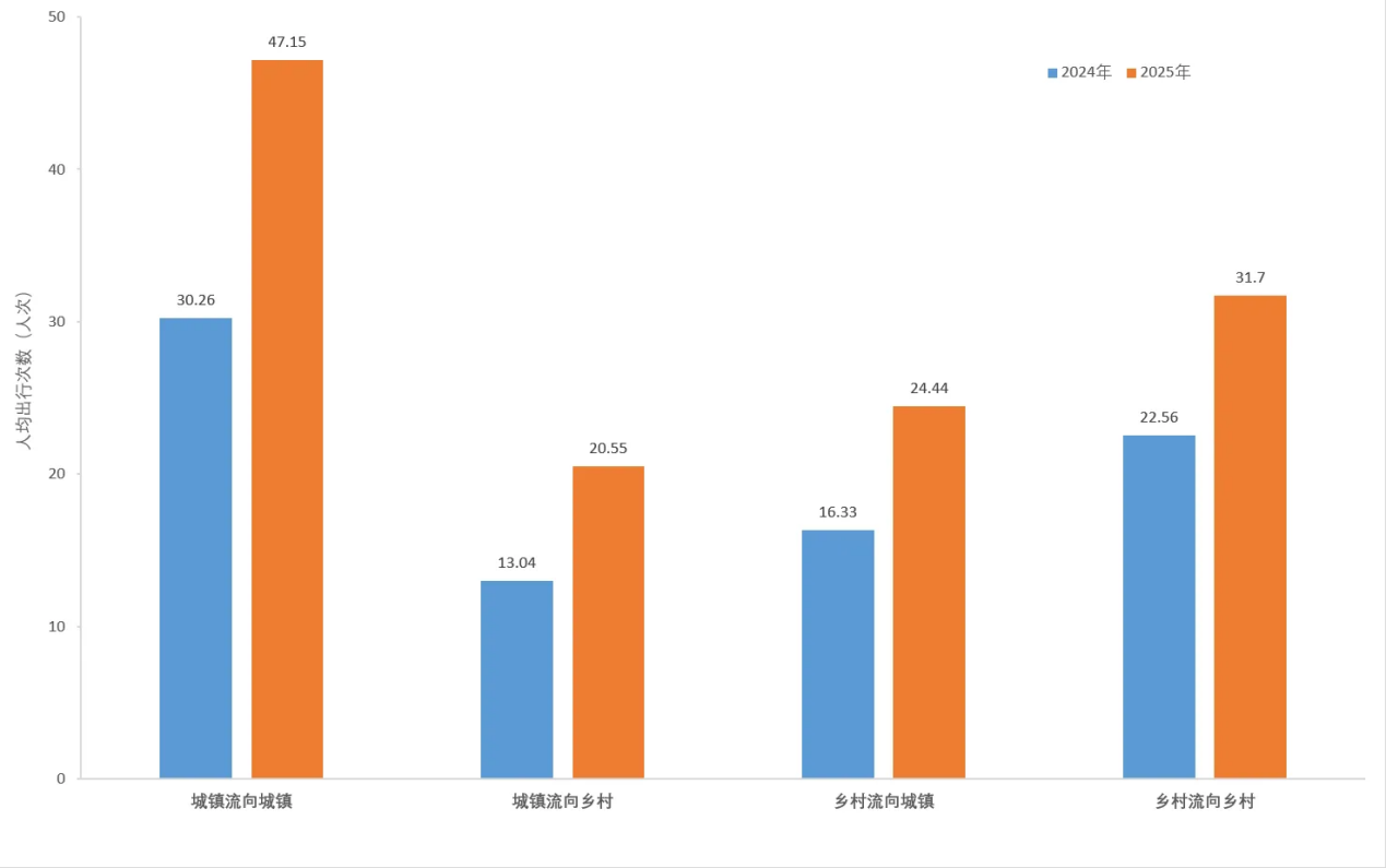 随着城乡融合和一体化政策的深入推进,2025年春节期间河南省城乡间流动总量显著增加,跨镇总流量达到62.15亿人次,远高于2024年同期水平。城乡流动不再局限于传统的季节性务工返乡,而是呈现出更多元化的特征,其中由城镇流向乡村的人均出行频次增幅最高,反映出城镇居民在节前返乡、参与年节活动以及返乡创业的趋势增强。这一现象表明,河南省城乡之间的联系更加紧密,城镇与乡村逐渐摆脱孤立状态,形成了人口、经济、资源双向流动的新格局。随着农村地区吸引力的提升,城乡融合将进一步促进经济互动与区域发展,为河南省未来发展提供更大潜力和空间。