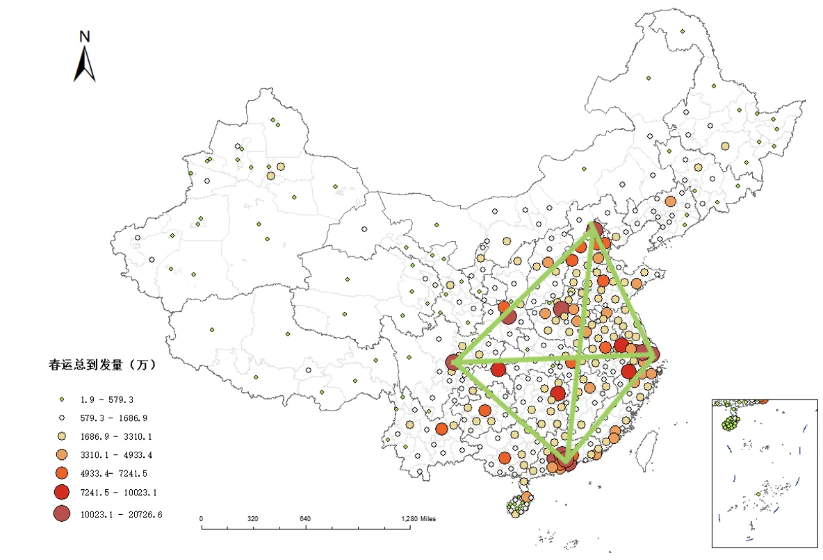 漫漫春运路,切切归家心。无论是远赴他乡的游子,还是家乡的守望者,春节的脚步都是我们心中最深的期盼。春运,是一场充满迁徙意义的归途,作为中国乃至全球范围内每年规模最大的人类周期性迁徙活动之一,伴随着高密度的人口流动,给交通运输和社会治理带来了诸多挑战。我们借助大数据这一新型生产要素进行科学预测,为治理决策提供有力依据。近年来,随着我国城乡融合政策的深入实施,以及交通基础设施的不断完善,显著缩短了城市与乡村之间的时空距离。高速公路、高铁和航空等交通方式的普及,使城乡间的人口流动变得更加便捷,春运也成为城乡融合发展的一个重要“探测器”。