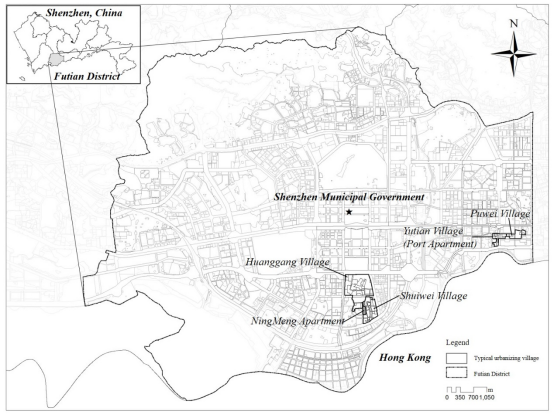 以位于深圳市福田区地理位置临近、建成环境相似的四个城中村为实证研究对象。其中,水围村和玉田村是深圳市首批开展综合整治的城中村,作为集中和分散两类综合整治模式的研究代表;皇岗村和埔尾新村分别紧邻水围村和玉田村,是未开展综合整治的普通城中村,作为比较对象。位于水围村的柠盟公寓和位于玉田村的泊寓分别代表了集中式整治和分散式整治两种模式。