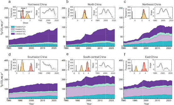 图3. 1980-2023年中国六大分区农业甲烷和氧化亚氮排放变化轨迹