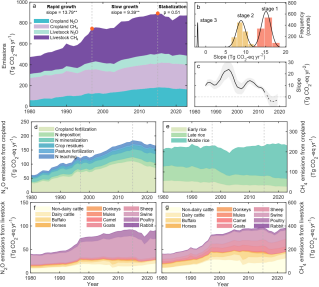 图2. 1980-2023年中国农业甲烷和氧化亚氮排放的时间变化