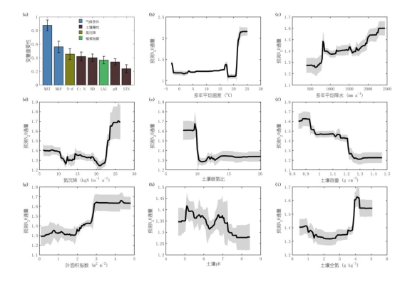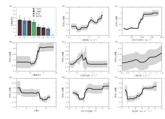 进一步地,该研究通过情景模拟分析,探究了氮沉降,降水,温度,植被叶面积指数(LAI),森林和草地面积对于N2O排放变化的贡献(图5)。结果表明,森林和草地面积变化贡献了77%的排放增量,氮沉降增加贡献了33%,而LAI、温度及降水的贡献相对有限,分别仅为4%、-4%和-10%。大规模植树造林导致的森林面积占比增加是过去43年间中国自然土壤N2O排放整体上升的核心因素。但需要注意这一结果仅表示核算边界的变化,并不意味着植树造林必然促进土壤N2O排放。