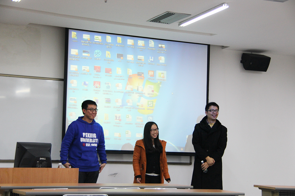 最后,班主任金珊老师表达了对班级学术与文体等各项活动的肯定,并提出下学期在注重学术的同时班级要多开展社会公益活动,勇于承担起北大学子的社会责任。陈可石老师对同学们提出继续“追求卓越”的希望,强调青年人要有追求与人文主义关怀,并有意识地丰富自己的阅历,要在年轻时做三件事:读书、旅行与恋爱,同时做到“不解释,不抱怨,不后悔”。