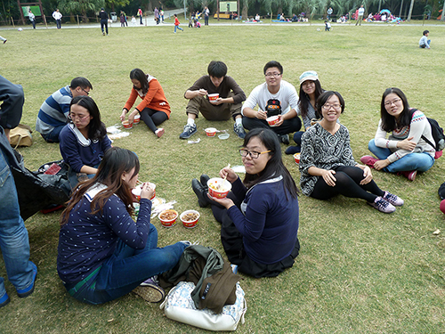 午餐时刻是又一个秋游活动的高潮点。临近午时,大家聚集在仙湖边的大草坪上,吹着凉爽沁人的微风,沐浴着艳而不骄的阳光,聊天、说笑、摆pose拍照,等待着我们的大餐。待大餐一到,大家围成一个个圈,一起分享着美食。一个个幸福的吃货,一张张天真无邪的笑脸,一幅幅恬静美好 的画面将我们城规公司一段小小的记忆留在了美丽的仙湖植物园。