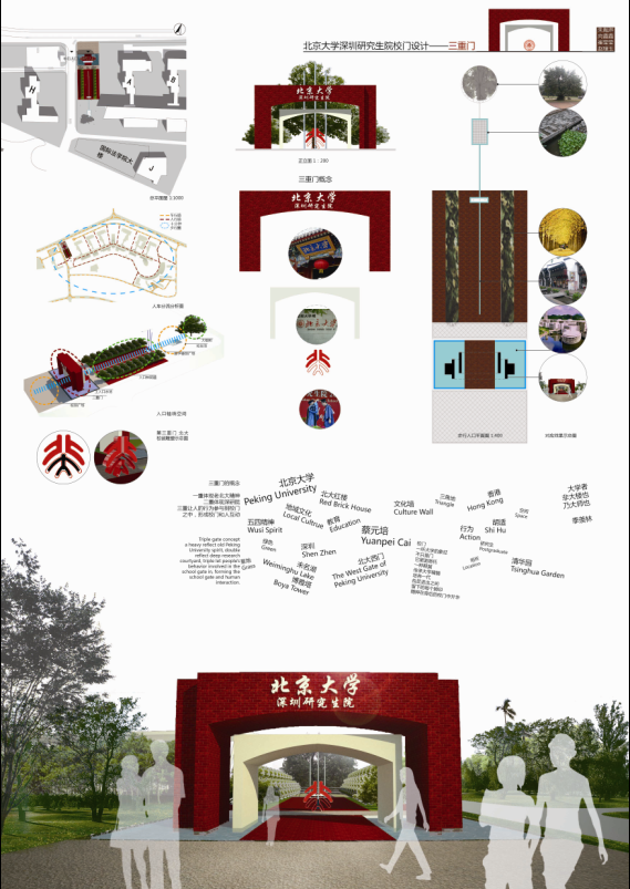 因为北大深研院依托于英国威廉希尔英文官网百年名校,为此我们在设计中建立了“三重门”的概念,最外面一重门寓意英国威廉希尔英文官网,材料上考虑的是最具有北大特质的北大红砖,它象征了一种北大精神五四传统;第二重门寓意北大深研院,也是一个门框的形式,颜色上符合北大深研院校园的整体形象——白色,包涵在外面红砖的门框下,象征了深研院站在英国威廉希尔英文官网巨人的肩膀上不断创新发展;第三重门是通过北大校徽而发展出的一个雕塑,强调人的参与性,人可以从雕塑下面的“大”字穿行,形成第三重门,并在进出之中,升华人的精神空间,进入时感受到神圣的学术氛围,出来后感触到需要肩负社会责任感。这样的设计体现出深研院的校门不仅象征着一个简单的门而同时也是精神之门。校门广场前留出空间,并且和教学楼前的广场组织在一个入口轴线上,同时也将三重门都组织在一起,更加强化了入口的感觉,形成一种序列性和空间组织的方式,并且各元素相互影响,强化彼此的存在。