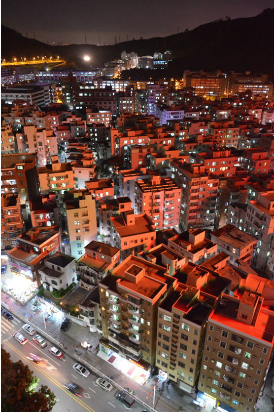 夜幕下的平山村:村里密集的楼宇争相向上生长,形成密集、繁杂、拥挤、多元却又充满活力、欣欣向荣的独特城市景观,这里既是城市的痼疾,又潜藏着城市的契机。